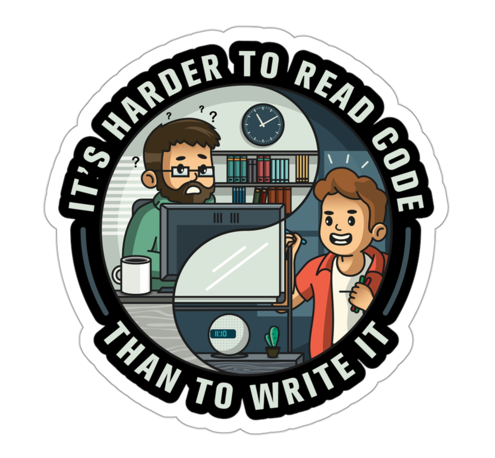 Illustration has that cartoonish feeling. However, it keeps that deep and serious vibe of transitioning from junior to senior engineer. It features a deep programmers quote, which amplifies the whole experience. For sure, it makes the wearer look wise and full of knowledge.